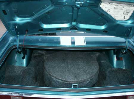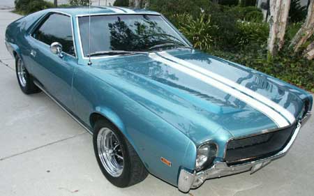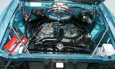 My 1969 AMX, Go Pac, Alamosa Aqua ORIGINAL paint, (clear coat Emeron over Factory paint job), white stripes painted on with Emeron, 15x7" Magnum 500`z front / 15x8" Magnums on rear, B.F.Goodrich VR4`s-235rear + 205front, 3.55 gears in rear end, MANY trophies, mostly from Big Events ( top 10, top 5, best muscle car, etc) AMC red-top battery from 70, AMC tissue box holder, etc. I hope you like it, I DO :-) Hobie.